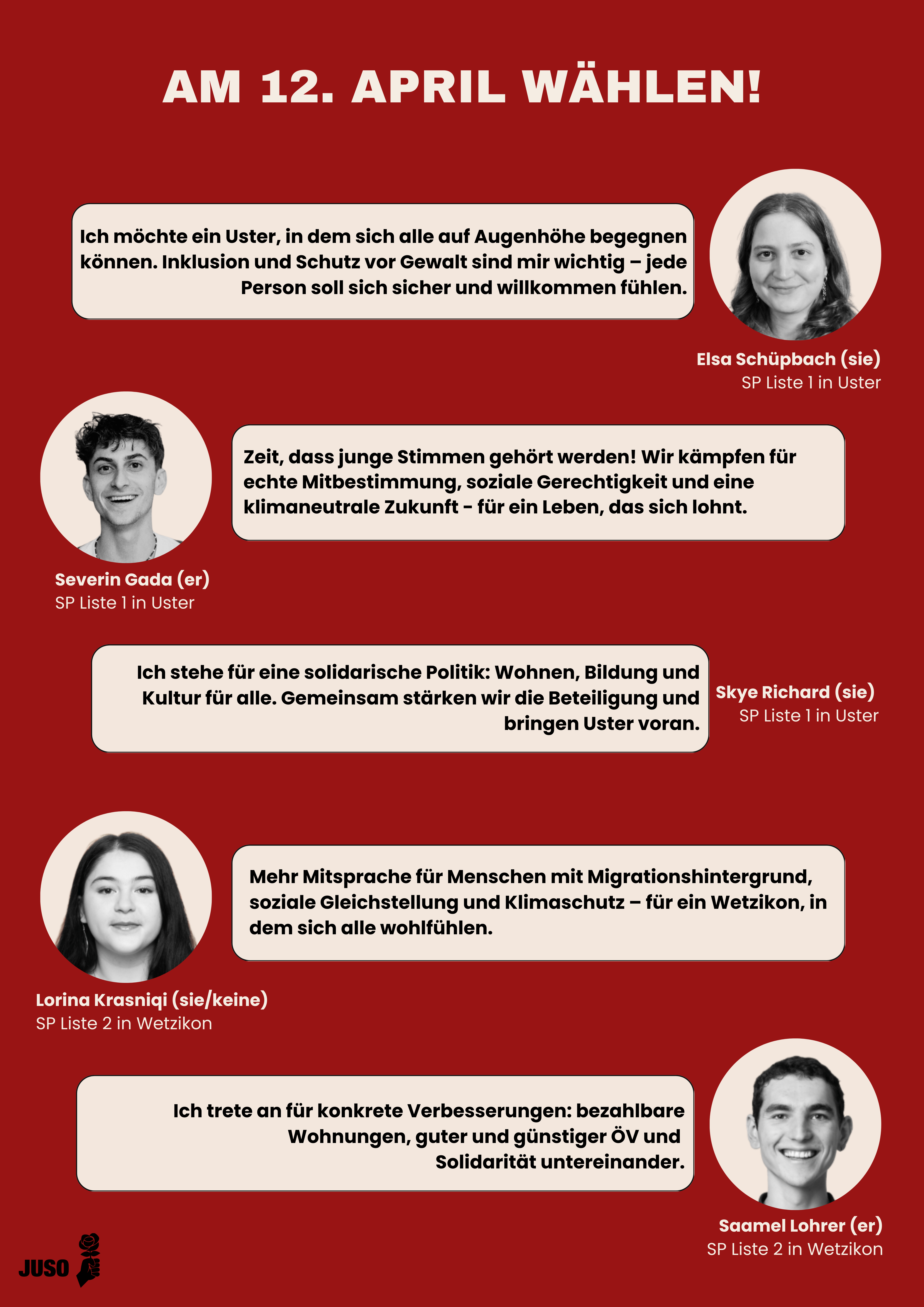 Weitere Mitglieder der JUSO treten auf der SP-Liste an: Elsa Schüpbach, Skye Richard, Severin Gada in Uster. Lorina Krasniqi in Wetzikon.